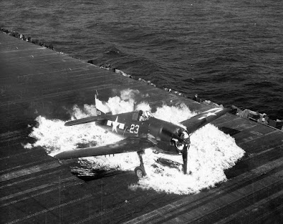 Secuencia de imágenes: Caza embarcado Grumman F6F-5 Hellcat №23, del Bombing Fighter Squadron 9 (VBF-9)/USS Lexington (CV-16). Su avión estalló en llamas cuando golpeó una barrera y otros aviones al aterrizar en la cubierta del portaaviones USS Lexington (CV-16) el 25 de febrero de 1945. En la secuencia, parece estar desabrochándose el cinturón de seguridad con calma y preparándose para escapar del infierno.